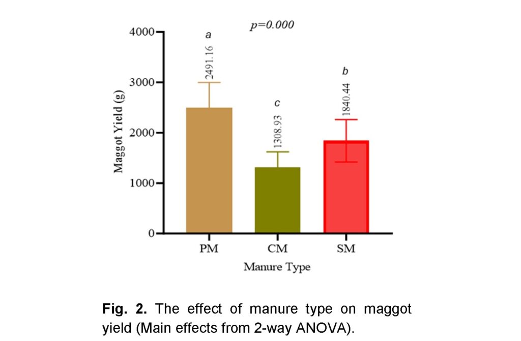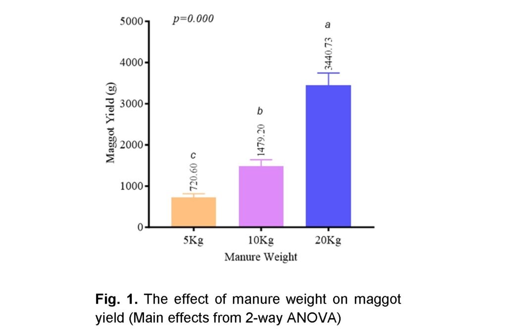 Statistical analysis further confirmed significant differences in maggot yield between the different manure types (p < 0.05). At each manure type, significant differences in yield were observed.